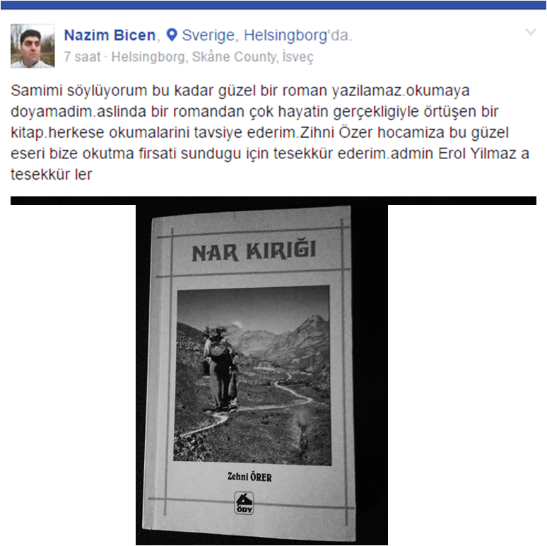 "Samimi söylüyorum bu kadar güzel bir roman yazılamaz. okumaya doyamadım aslında. bir romandan çok hayatın gerçekliğiyle örtüşen bir kitap. herkese okumasını tavsiye ederim. Zihni Özer (Örer) hocamıza bu güzel eseri bize okutma fırsatı sunduğu için teşekkür ederim. admin Erol Yılmaz'a teşekkürler"